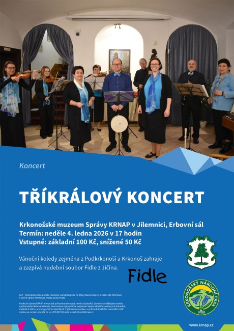 Přijměte pozvání na Tříkrálový koncert do Krkonošského muzea Správy KRNAP v Jilemnici. Vánoční koledy zejména z Podkrkonoší a Krkonoš zahraje a zazpívá hudební soubor Fidle z Jičína.