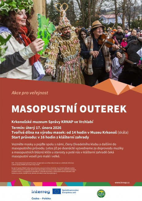Srdečně zveme na dvanáctý ročník obnovených masopustních tradic ve Vrchlabí. Vezměte masky a zapojte se do veselého průvodu. Za doprovodu muziky a masopustních bláznů půjdeme vyzvednout klíče ke starostovi a poté nás v klášterní zahradě čeká masopustní veselí pro malé i velké.